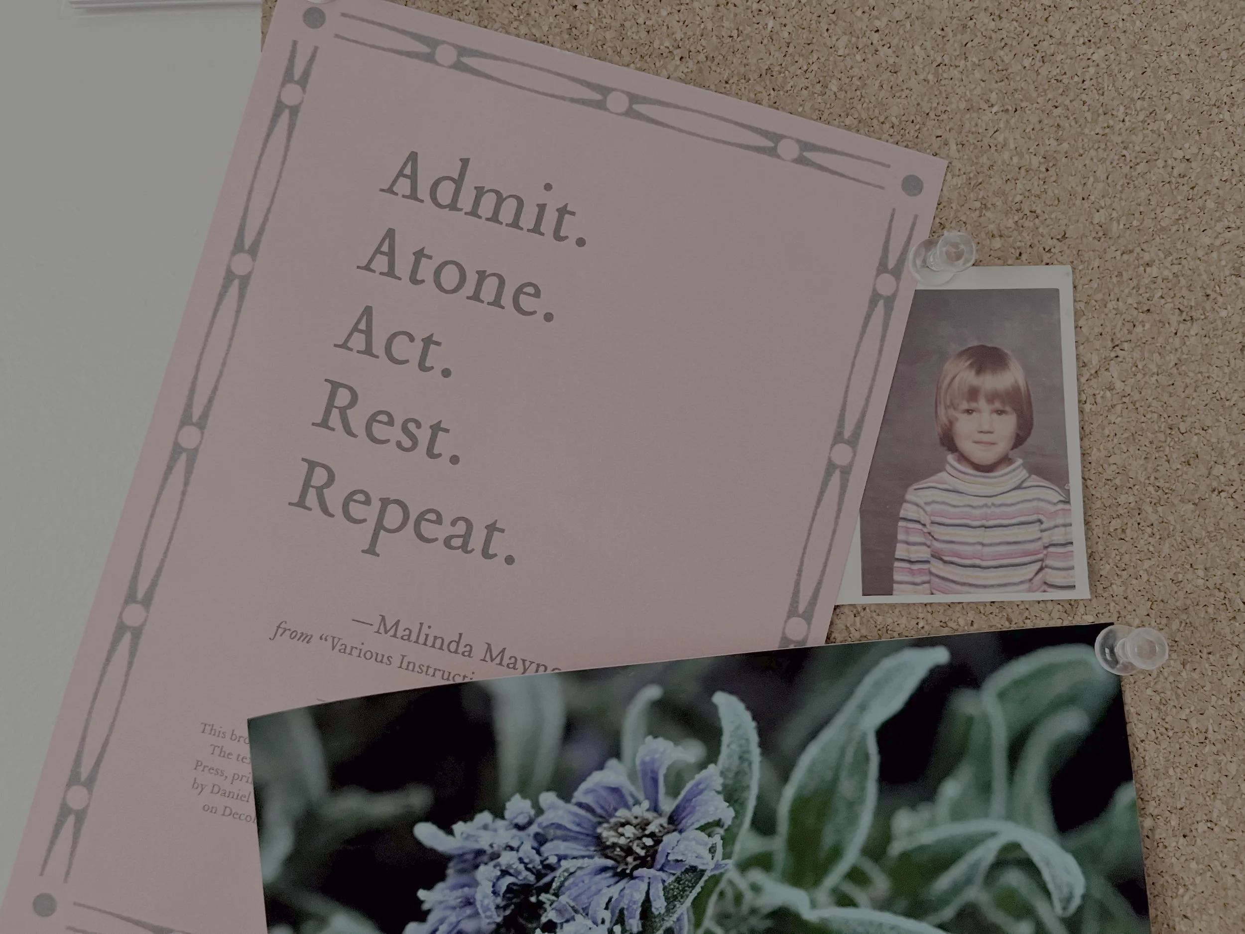 A glimpse of my bulletin board: Letterpress Card from Ecotone Magazine that says: “Admit. Atone. Act. Rest. Repeat.” by Malinda Maynor Lowery of the Lumbee tribe. Little Mel. An image of frosted flowers from a dear friend.